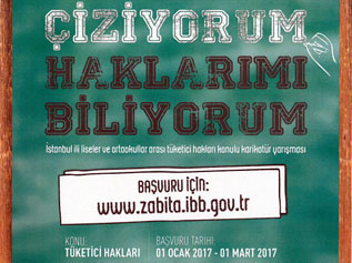 Slogan : “Çiziyorum Haklarımı Biliyorum” Karikatür YarışmasıKonu : Tüketici Hakları Kapsam : İstanbul geneli Orta Okul ve Liseler arasıBaşvuru : 01 Ocak 2017- 01 Mart 2017Başvuru adresi : www.zabita.ibb.gov.tr