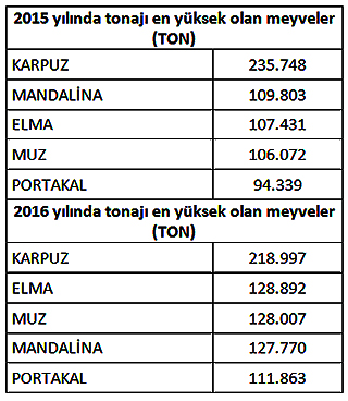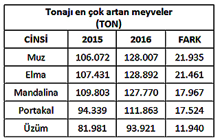 Tonajları en çok artan meyvelere baktığımızda, 2016 yılında bir önceki yıla göre en büyük artış muzda yaşandı. Muzun tonajı 21 bin 935 artarken, tonajı artan diğer meyveler ise; 21 bin 461 tonla elma, 17 bin 967 tonla mandalina, 17 bin 524 tonla portakal ve 11 bin 940 tonla üzüm oldu.
