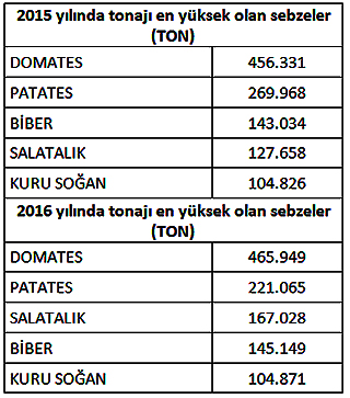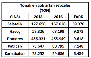 Tonajları en çok artan sebzelerde ise salatalık ilk sırada yer aldı. 2015 yılında 127 bin 658 ton olan salatalığın tonajı, 2016 yılında 39 bin 370 ton artış göstererek 167 bin 28 tona yükseldi ve tonajı en çok yükselen sebze oldu. Salatalığın ardından ise sırasıyla havuç, domates, patlıcan ve karnabahar yer aldı.