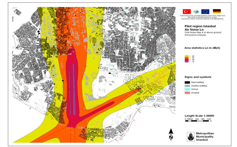 Sarı, 45 dBA dan fazla maruz kalınan gürültüyü göstermektedir. |